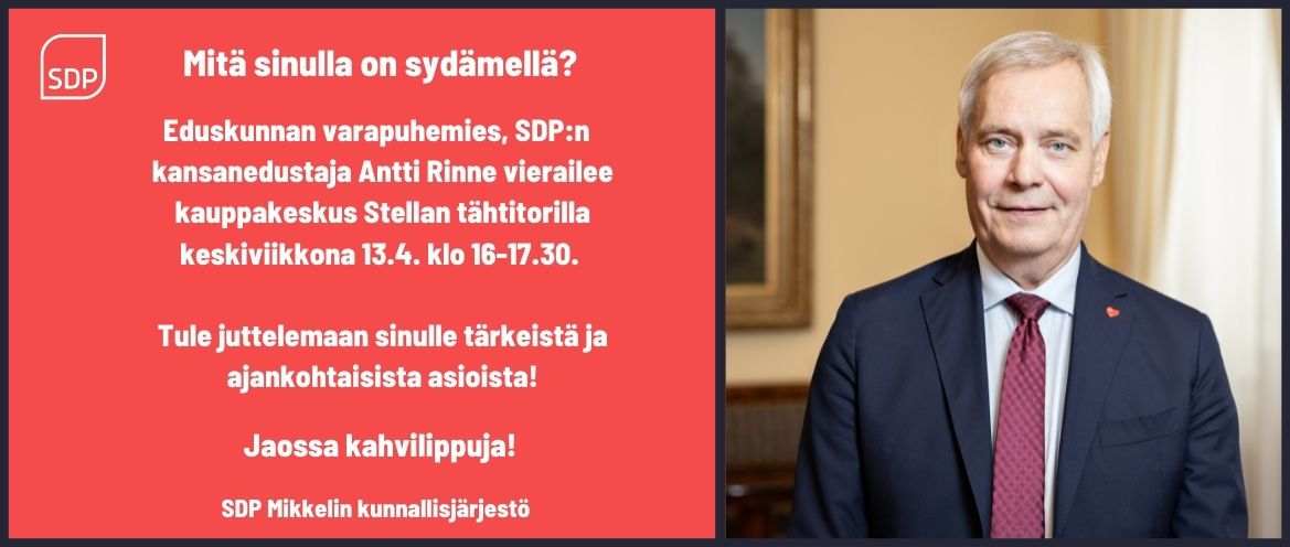 Antti Rinne vieraillee Mikkelissä 13.4.2022 kauppakeskus Stellan Tähtitorilla klo 16.00-17.30.
