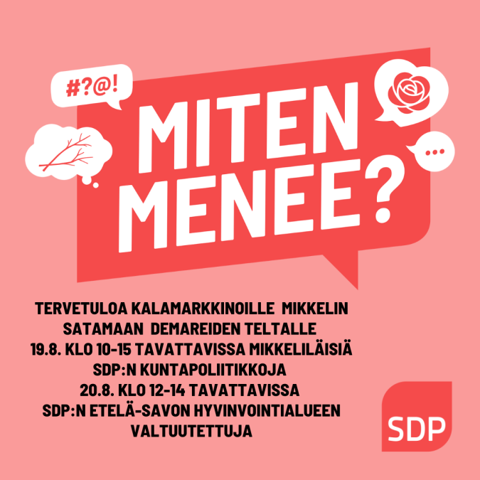 20.8. klo 12-14 tavattavissa SDP:N Etelä-Savon hyvinvointialueen valtuutettuja