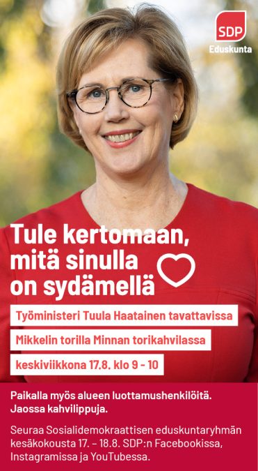 Työministeri Tuula Haatainen vierailee Minnan torikahvilassa keskiviikkona 17.8.2022 klo 9-10 Tervetuloa! Jaa tämä artikkeli Facebook Twitter LinkedIn All events